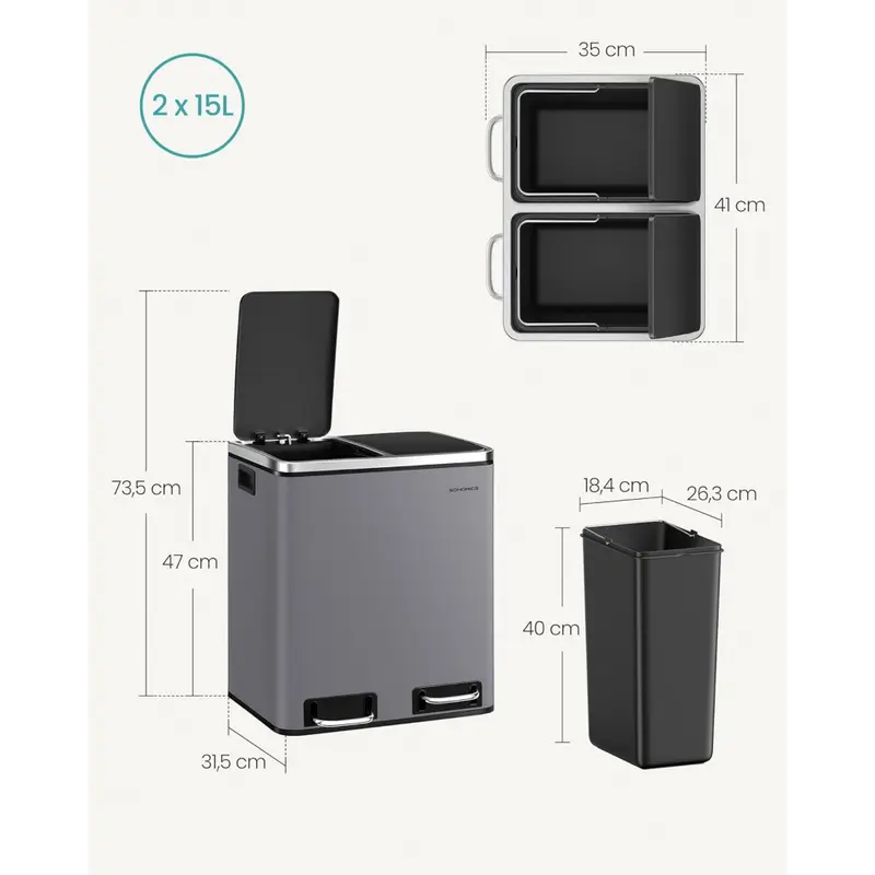Kitchen Trash Can, 2 x 15 Liters, 2-Compartment Waste Separation System, Includes 15 Garbage Bags, Waste Bin, Kick Bin, Recyclable Waste, Organic Waste, Softclose Lid, Compact Design, Rust Resistant, Modern Look, Removable Inner Buckets, Foot Pedal, Soft Close Lids, Practical Handles