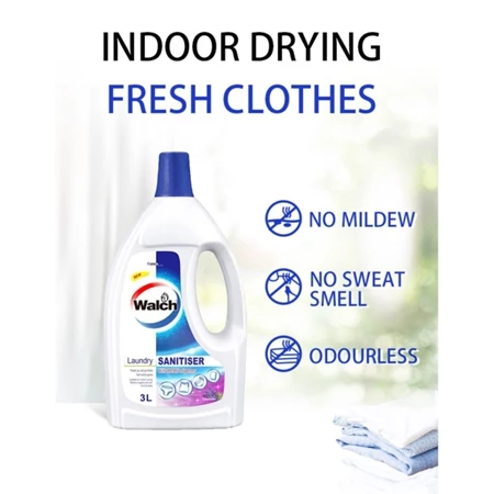 Walch® Laundry Sanitiser Disinfectant dissolves quickly during wash and thus is able to enter deep into cloth fibres to thoroughly sterilise your clothes. It also retains hygiene and clothes washed and suitable for indoor drying.